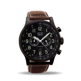 Das markante schwarze Gehäuse zieht alle Blicke auf sich, während das weiche braune Lederarmband die elegante Vintage-Optik traditioneller Fliegeruhren aufgreift. Das klare schwarze Zifferblatt verfügt über einen präzisen Chronographen – ideal für Liebhaber von Stil und Genauigkeit.